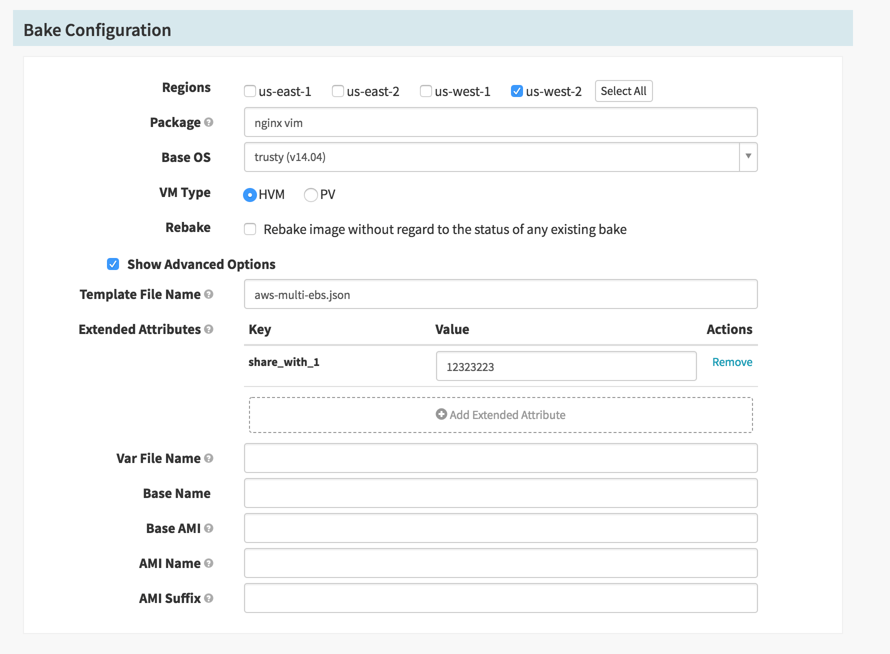 Then add an Extended Attribute. Have the key be share_with_1 and the value being the target AWS account ID that was used for SPINNAKER_AWS_DEFAULT_ACCOUNT. share_with_1 is for ami_users inside Packer.
