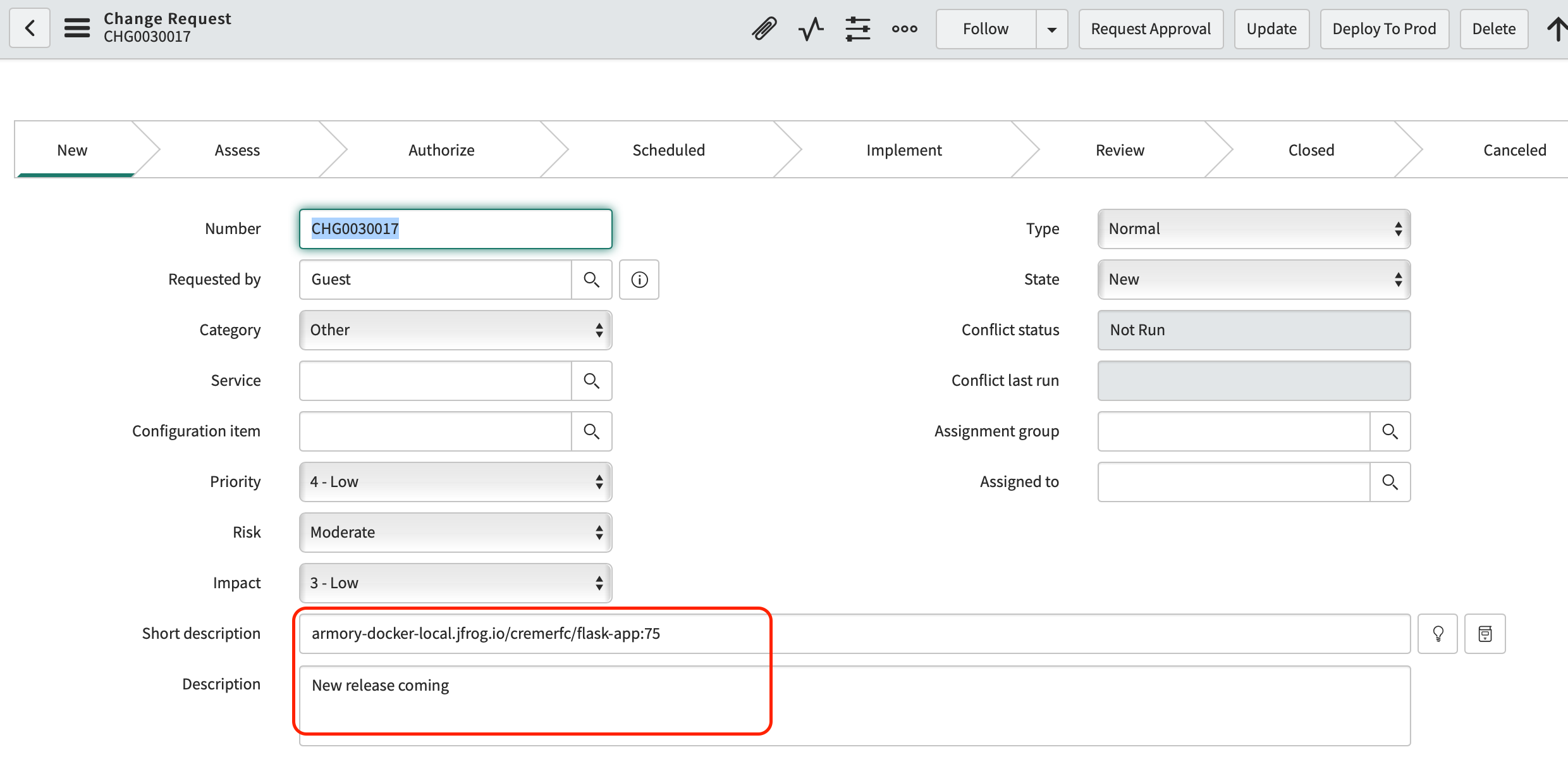 - A deployment happens and a ticket needs to be filed in ServiceNow for record keeping