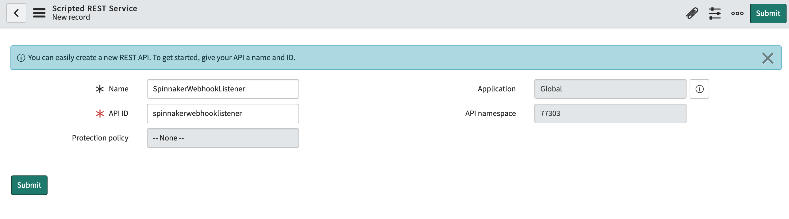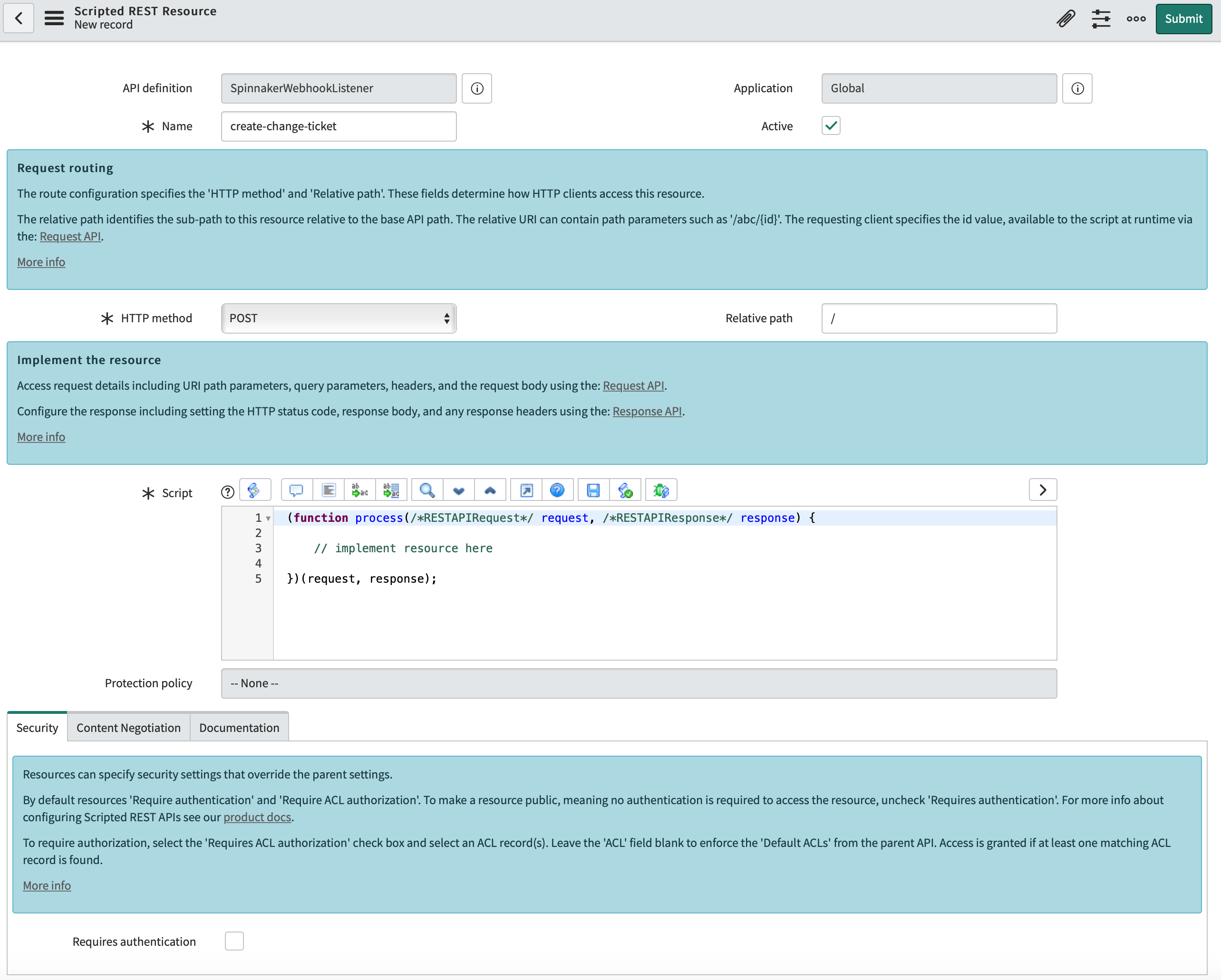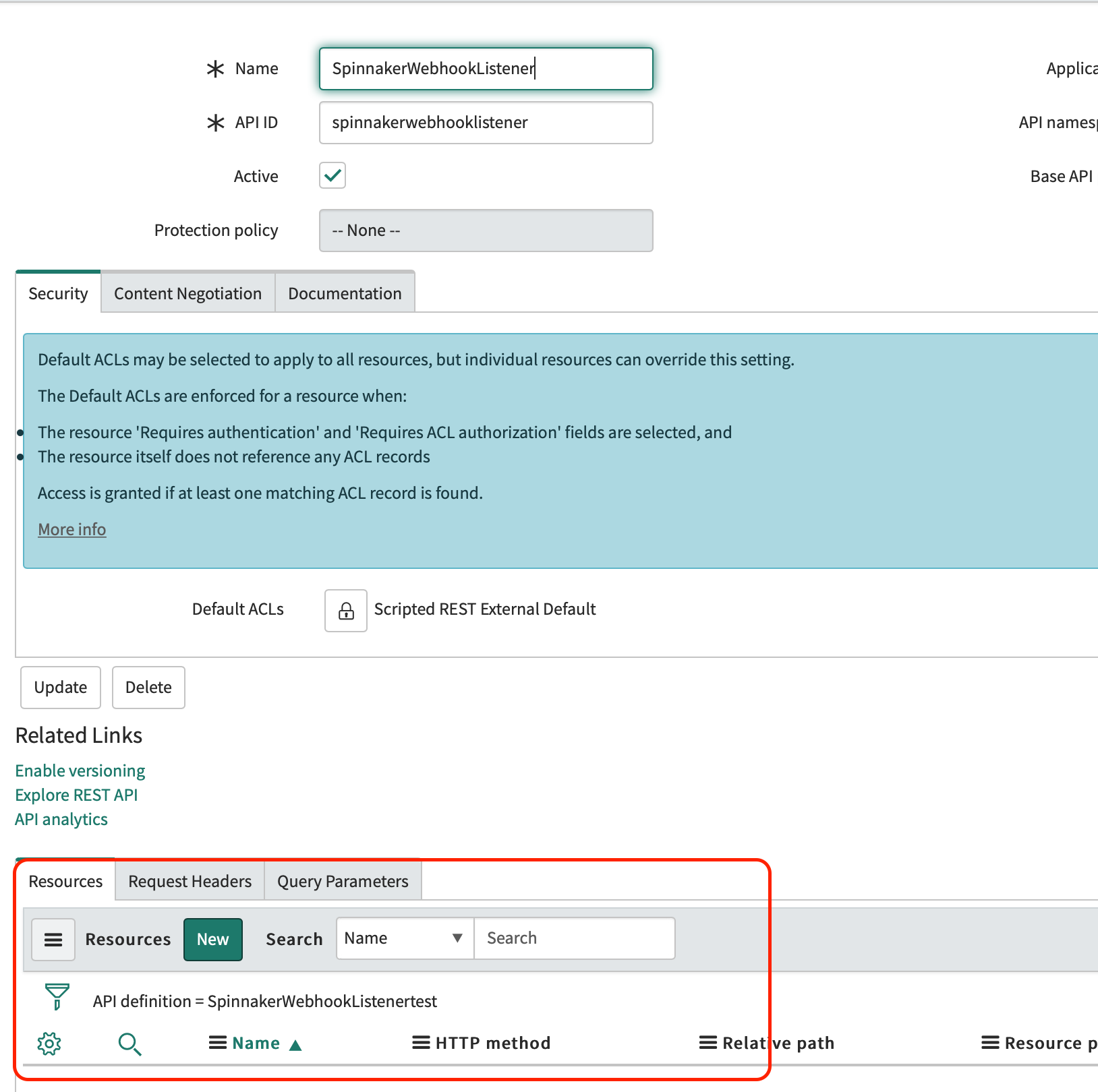 You can create multiple Resources, each with its own specific URL and script to do something. In this example, the “SpinnakerWebhookListener” is the Scripted REST API that handles all the various calls that Spinnaker makes to this specific ServiceNow Instance. You define Resources to handle each specific call. For example, you may want to create separate calls to create different type of tickets or perform different actions within ServiceNow.