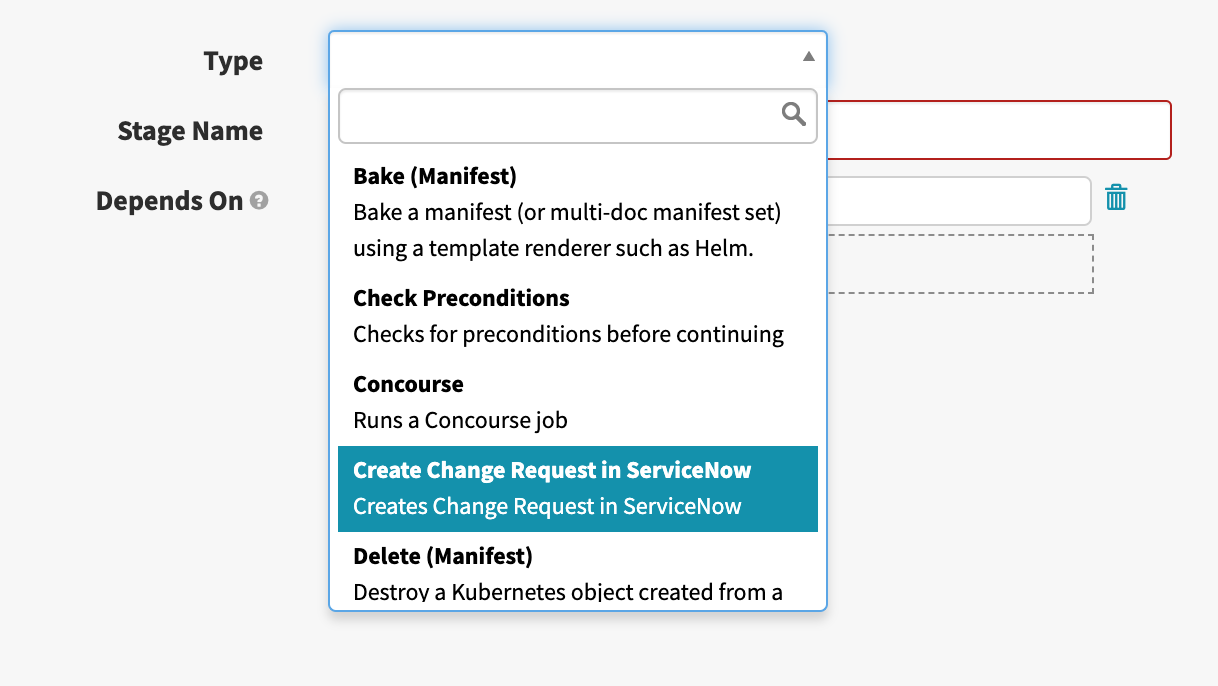 /home/spinnaker/.hal/default/profileson your Halyad pod, editorca-local. If the file does not exist, create it. Below are the contents of my orca-local.yaml that generated my custom ServiceNow stage:webhook: preconfigured: - # stage name in stage selector drop down label: "Create Change Request in ServiceNow" enabled: true # UI description for stage description: Creates Change Request in ServiceNow # stage 'type' in stage definition type: createChangeSNOW # Webhook type method: POST # URL for webhook call url: https://dev102110.service-now.com/api/77303/spinnakerwebhooklistener customHeaders: # Any necessary headers (supports S3 / Vault) # Authorization: Basic c2VydmljZWFjY291bnQ6cGFzc3dvcmQK Content-Type: application/json # Payload for the request payload: |- { "application": "${trigger\['artifacts'\][0]['reference']}" "description": "${parameterValues['description']}" } # Zero or more parameters parameters: - label: Description (optional) name: description description: Enter a description for the ServiceNow Change Request type: stringNote that the example payload contains the two key/pair values that ServiceNow is expecting.