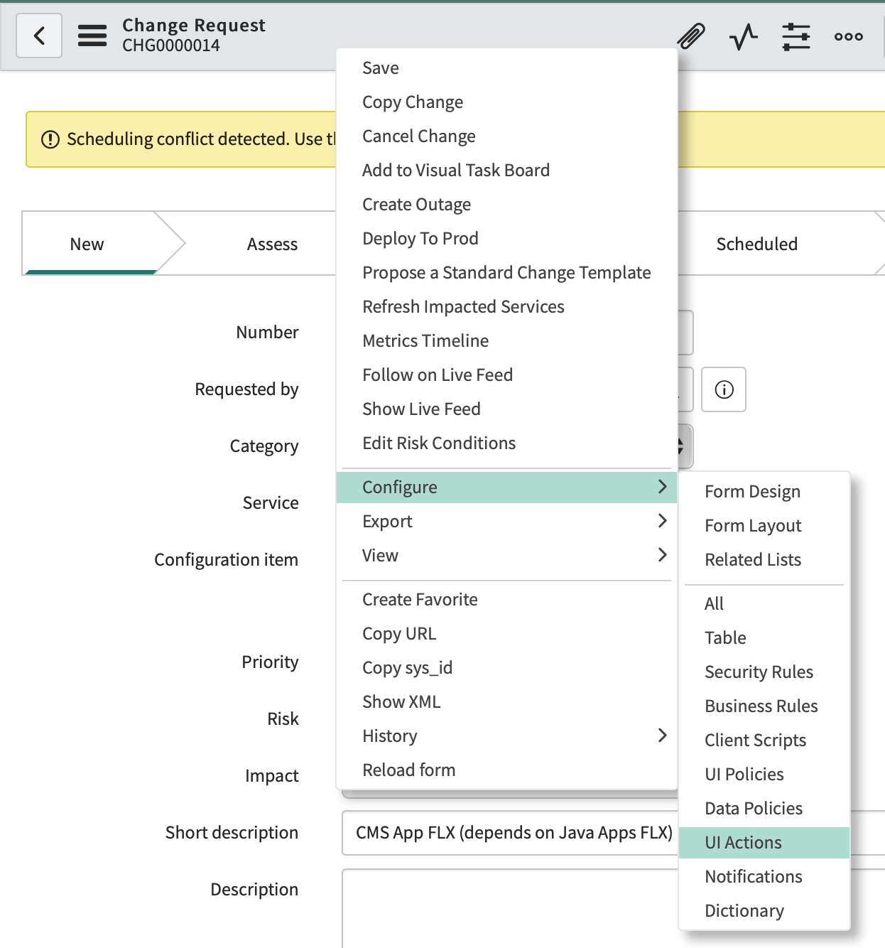 Click on Change > Open to get a list of all open Change Requests. Open any of Change Request from the list and right click on the top of the form as shown below to select Configure > UI Actions: