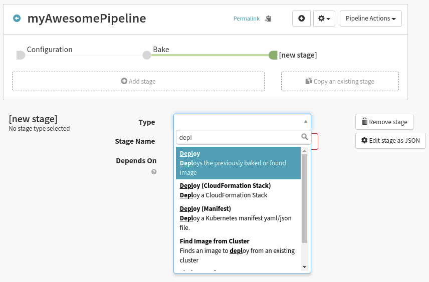 Now add a Deploy stage by clicking Add stage again. Select Deploy In the Type drop down list. Deploy’s configuration settings should pop up on the screen.