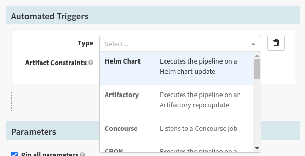 Define how your pipeline is triggered. Scroll down to the Automated Triggers section and click Add Trigger. This section enables you to select a Type: