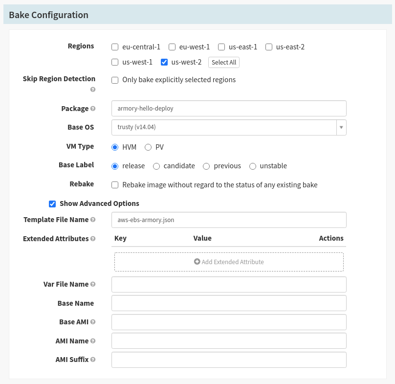 If you have multiple providers configured, select Amazon from the Provider drop down list. Next select the region or regions you want to bake in. In the Package field, enter the name of the package that your Jenkins job archived.