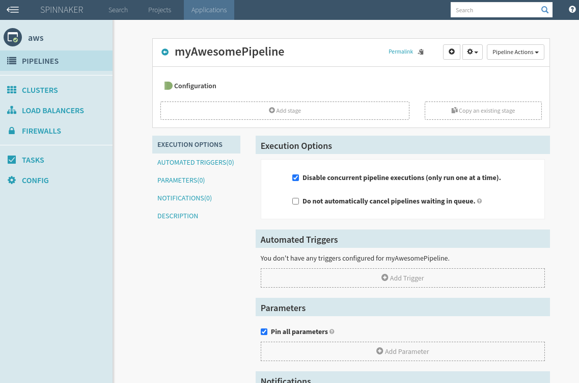 The pipeline is the key deployment management construct in Spinnaker™. It consists of a sequence of actions, known as stages. You can pass parameters from stage to stage along the pipeline.