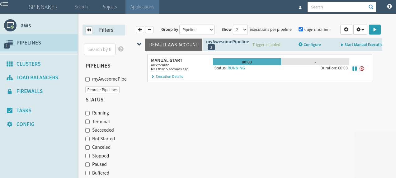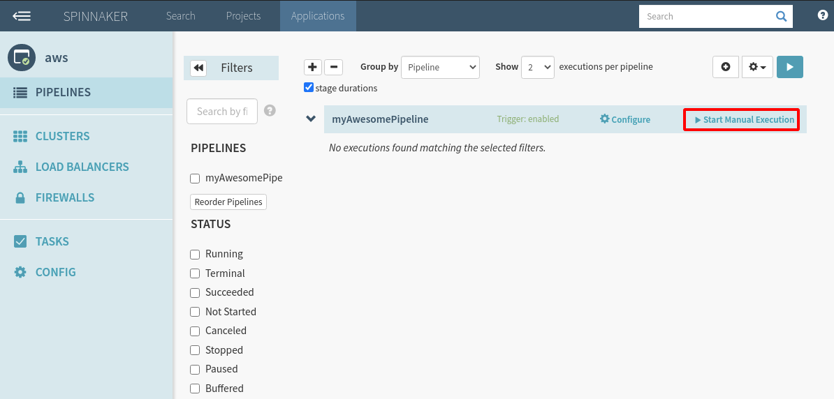 Click on the Pipelines option. You should see your new pipeline. Click on Start Manual Execution.