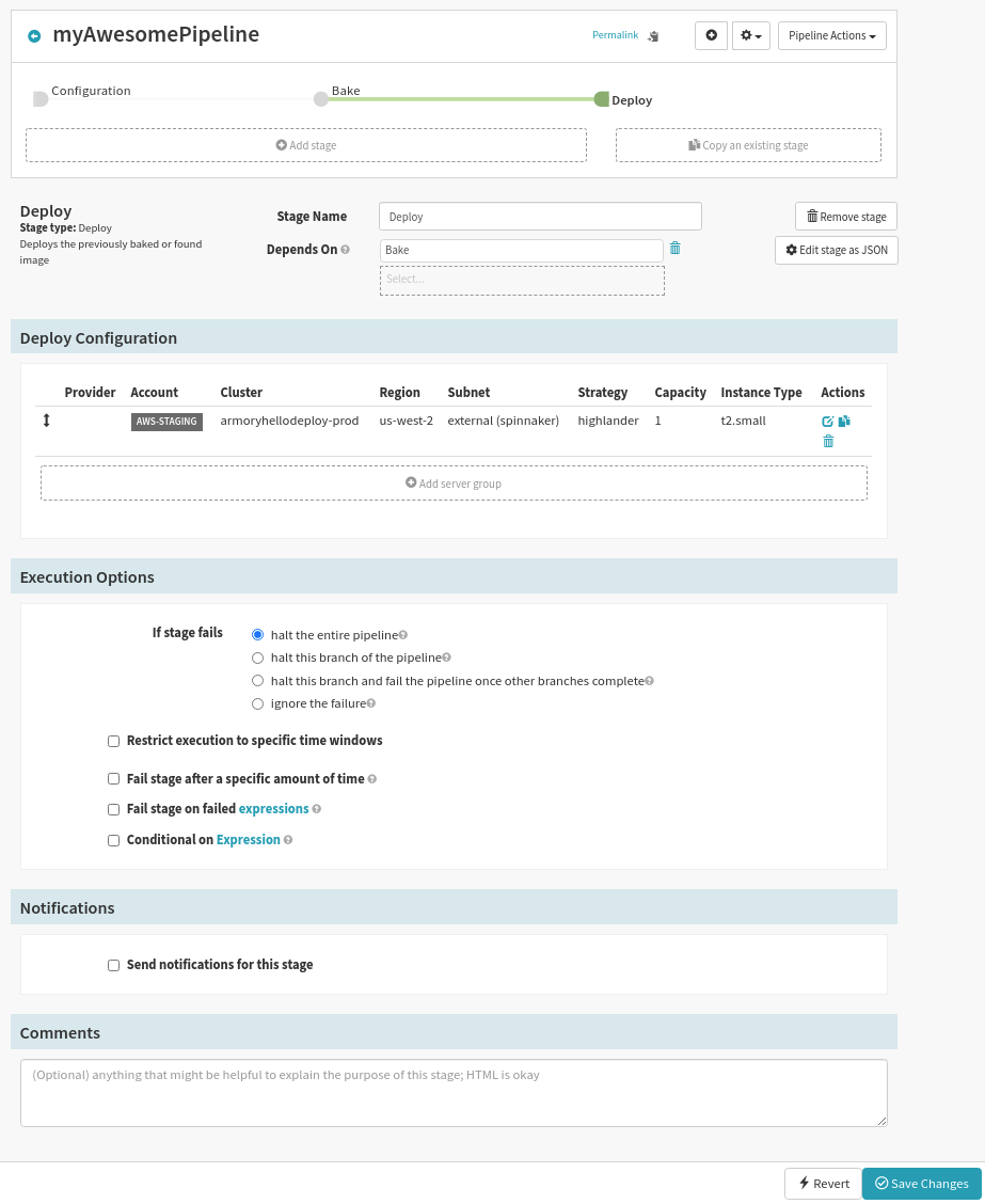 This example creates a pipeline that takes the Debian package produced by a Jenkins job and uses it to create an Amazon Machine Image (AMI) before deploying that image to a server group.