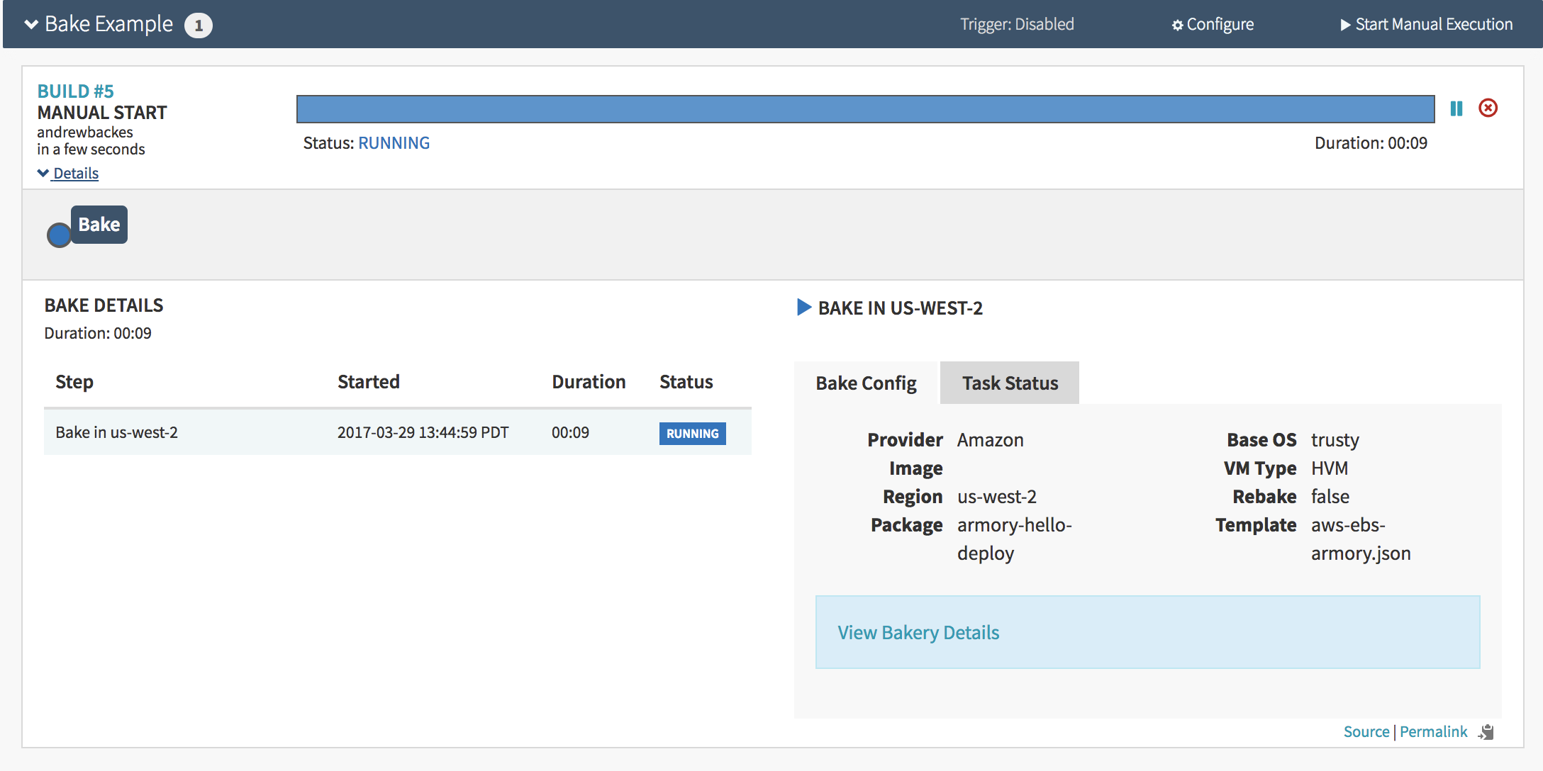 If I press ‘Start Manual Execution’ again, since the package version hasn’t changed, it will reuse the same image rather than rebaking. The screen for that looks like:
