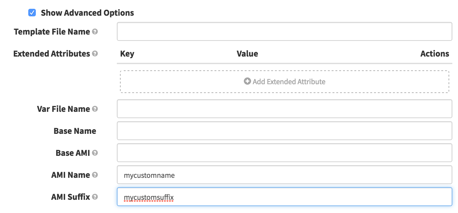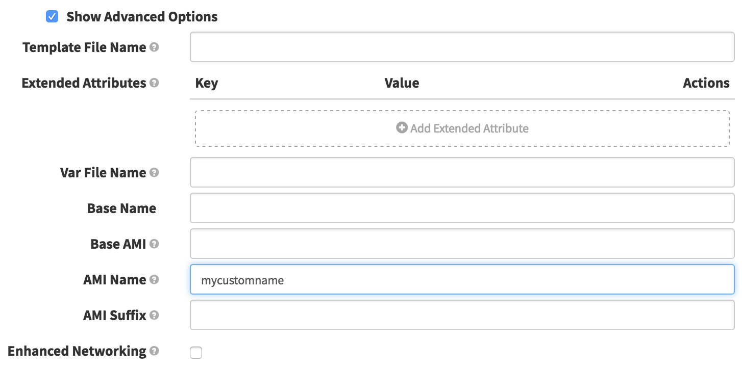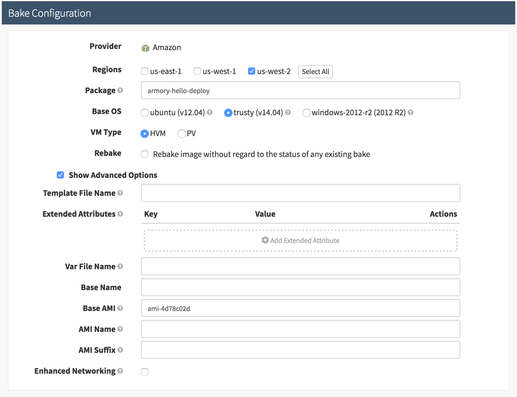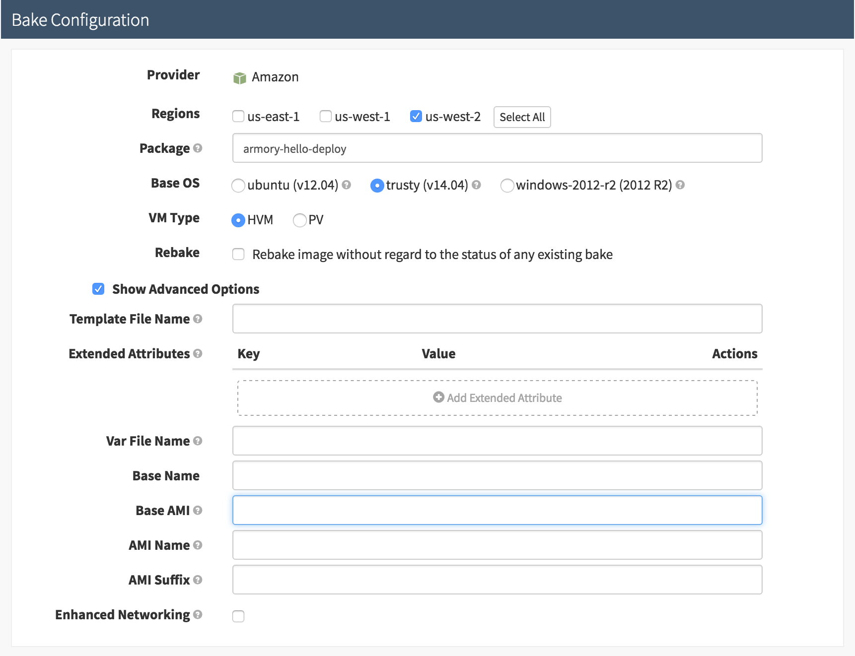 If you would like to change the name in AWS of your AMI, you can do so by selecting the ‘Show Advanced Options’ checkbox in the Bake Stage Configuration. Continuing from our example above, when I see: