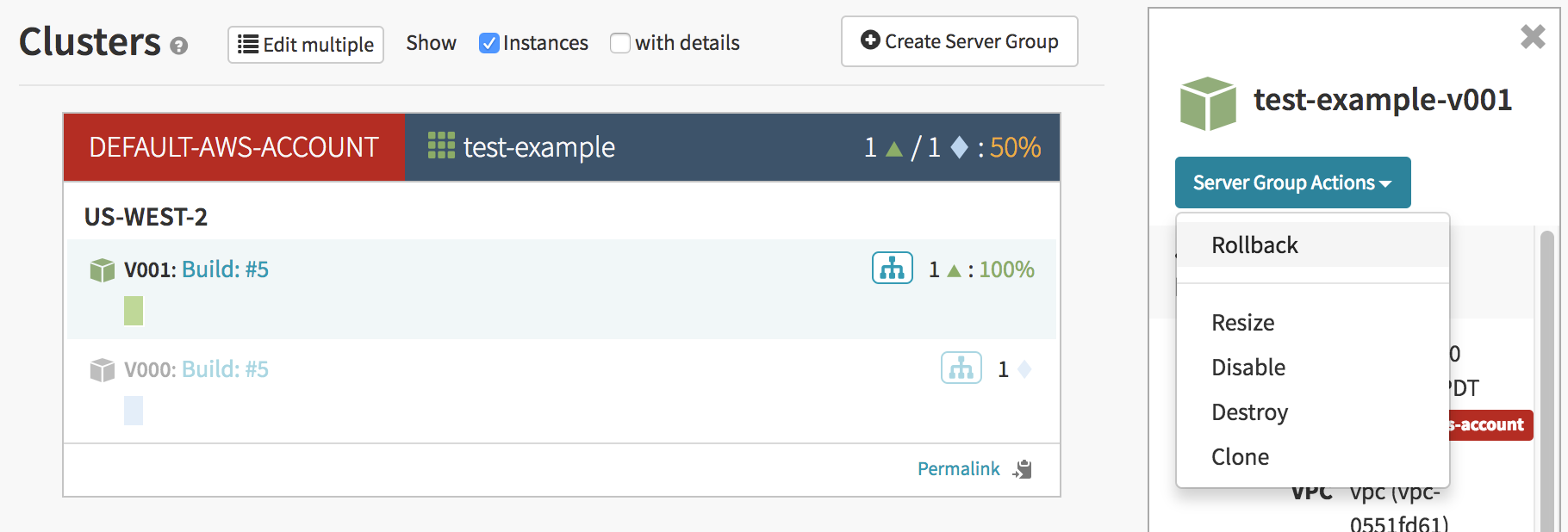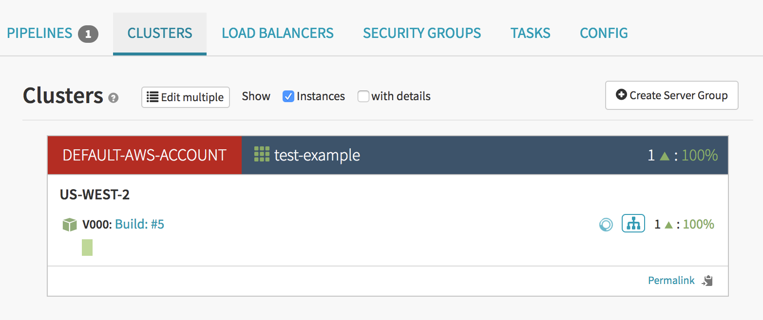 Because of how I configured my deploy stage, the old Blue server group will stick around until I either manually scale it down or destroy it. If you like, you can configure your deploy stage to automatically scale down the old server group after the new one is healthy.