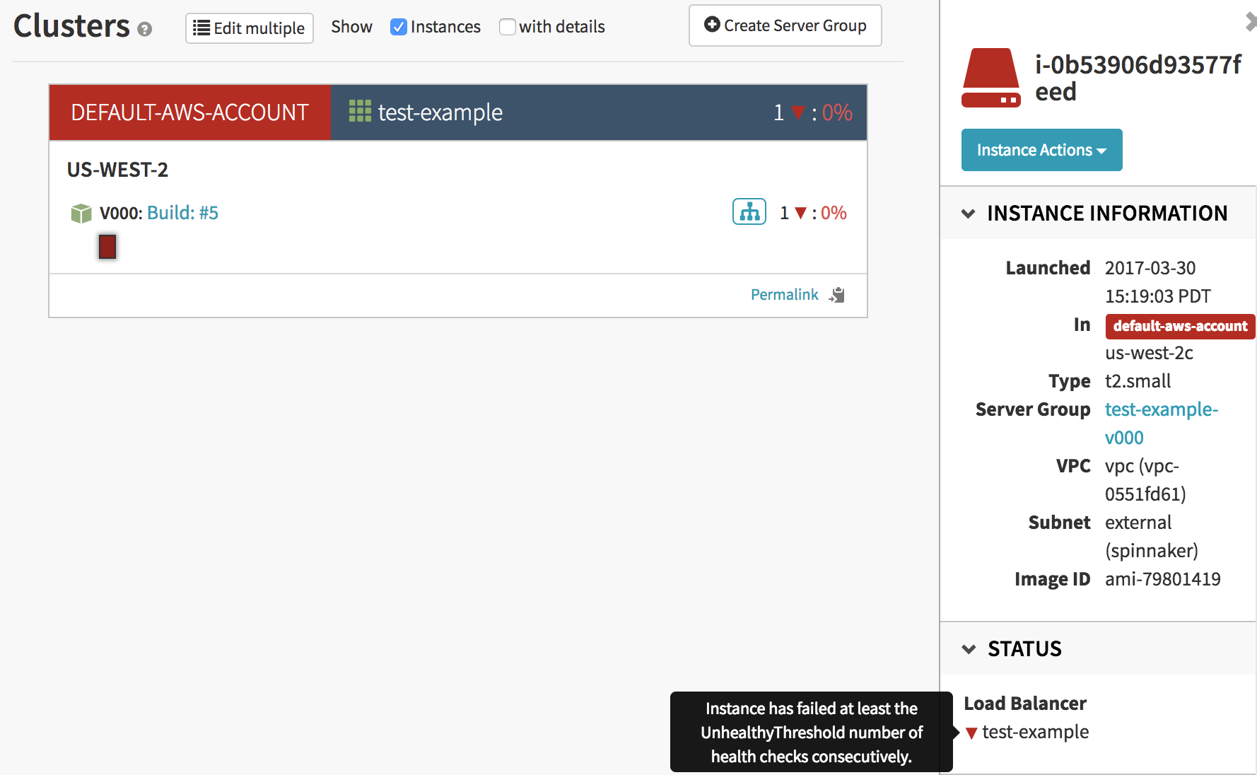 Select your red instance and hover your cursor over the red triangle next to the load balancer under the ‘Status’ section. This should display some helpful information for understanding why your instance is not deploying correctly.
