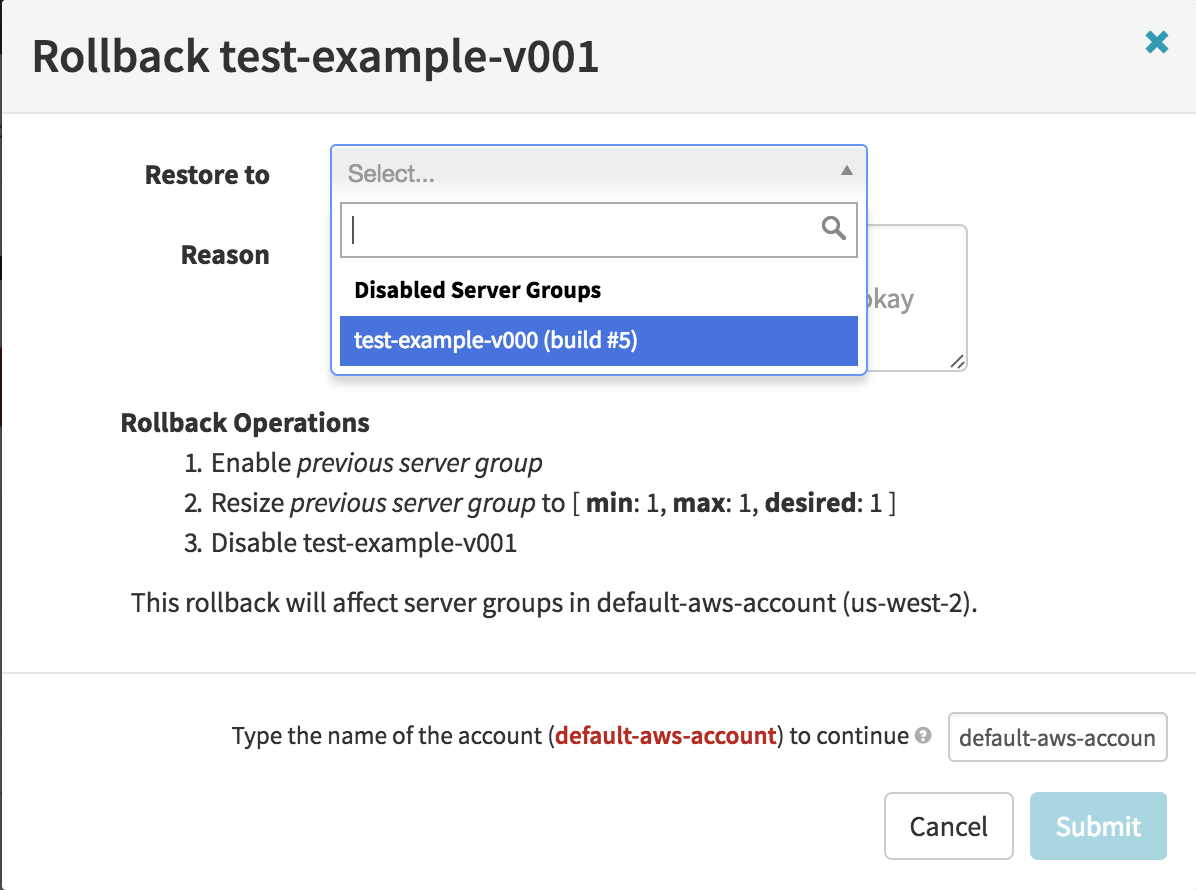 If you are ever in a situation where you need to roll back without Spinnaker, you can do so from the AWS console. You will basically run through the process that Spinnaker would do automatically: