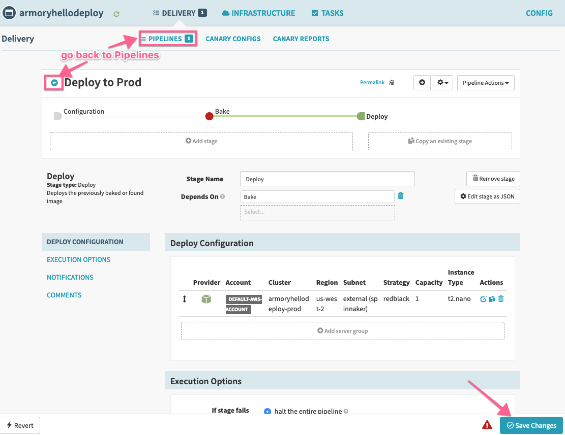 Finally, we can click Save Changes and select the back arrow to return to the Pipeline Executions screen.