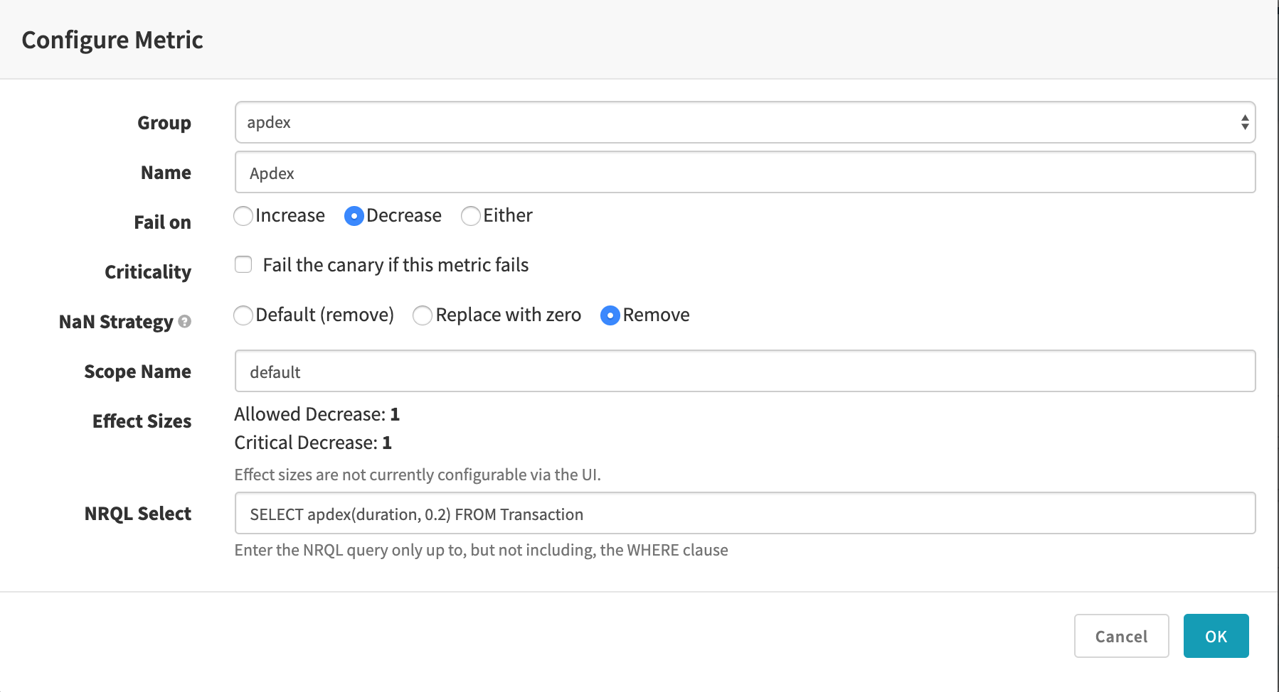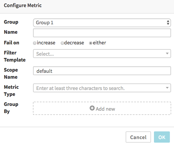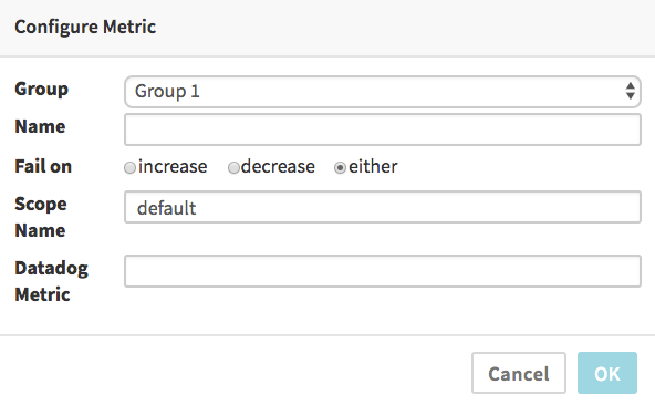 By default the “Fail on” selection of “either” means the comparison of canary and baseline metrics will be marked as a failure if the canary’s data is either significantly greater or less than the baseline’s data. You can select “increase” if you only want to fail when the canary’s metrics are significantly higher than the baseline (useful for things like error counts, memory and CPU usage, etc, where a significant improvement is not a failure), or, conversely, select “decrease” for the opposite (useful for metrics that measure things where bigger numbers are always better).