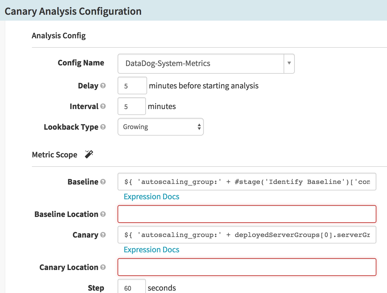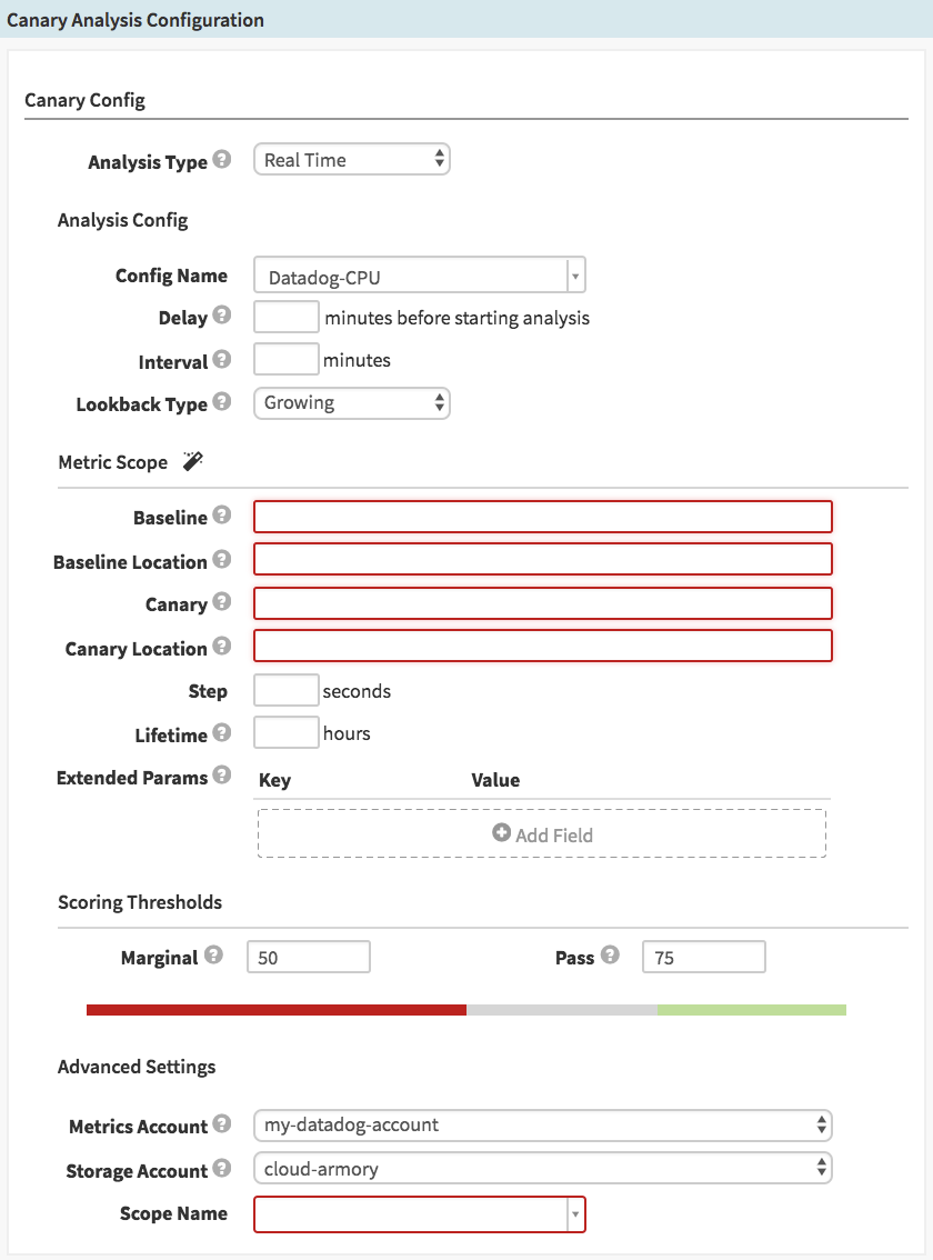 If everything is configured properly, you should be able to create a stage of Type “Canary Analysis”. The stage form should look like this: