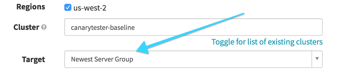 In this stage, we want to find our baseline, based on what’s currently in production. We select our production cluster and then look for the “Oldest” enabled Server Group. This will later be referenced to act as our baseline server group for the canary.
