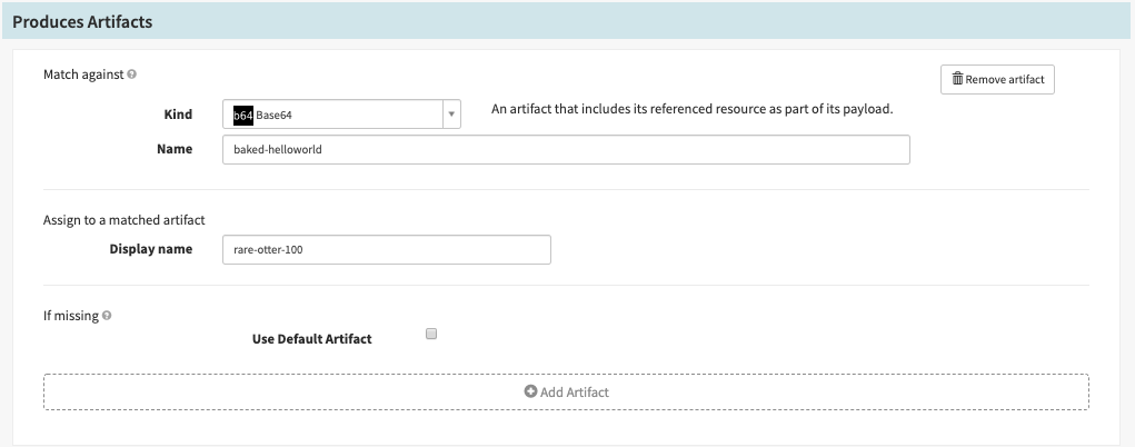 Spinnaker returns the manifest in a Base64 encoded file, so it is necessary to Produce a single Base64 Artifact in this Bake (Manifest) stage: