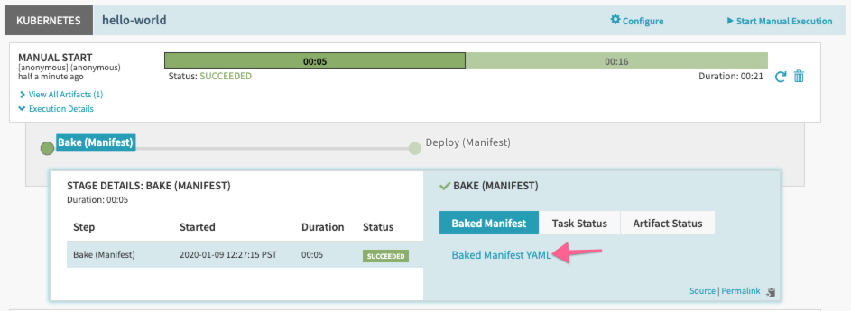 After you execute the pipeline, you can see the manifest generated in YAML format by clicking on the Baked Manifest YAML link: