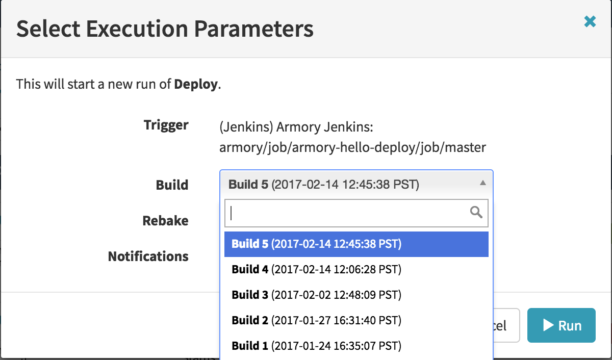 If your pipeline has a Jenkins’ trigger, you can select which Jenkins’ build number to use for running the pipeline.