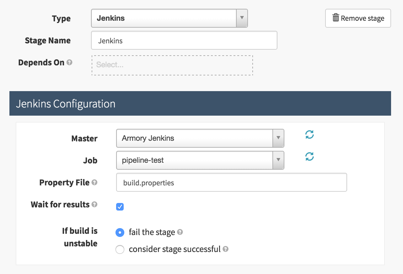Before you start, you need to configure Jenkins. If you don’t see Jenkins as an option, or you’re not seeing the correct master/job combination in the UI, you’ll need to double-check your Spinnaker is configured to use that resource.