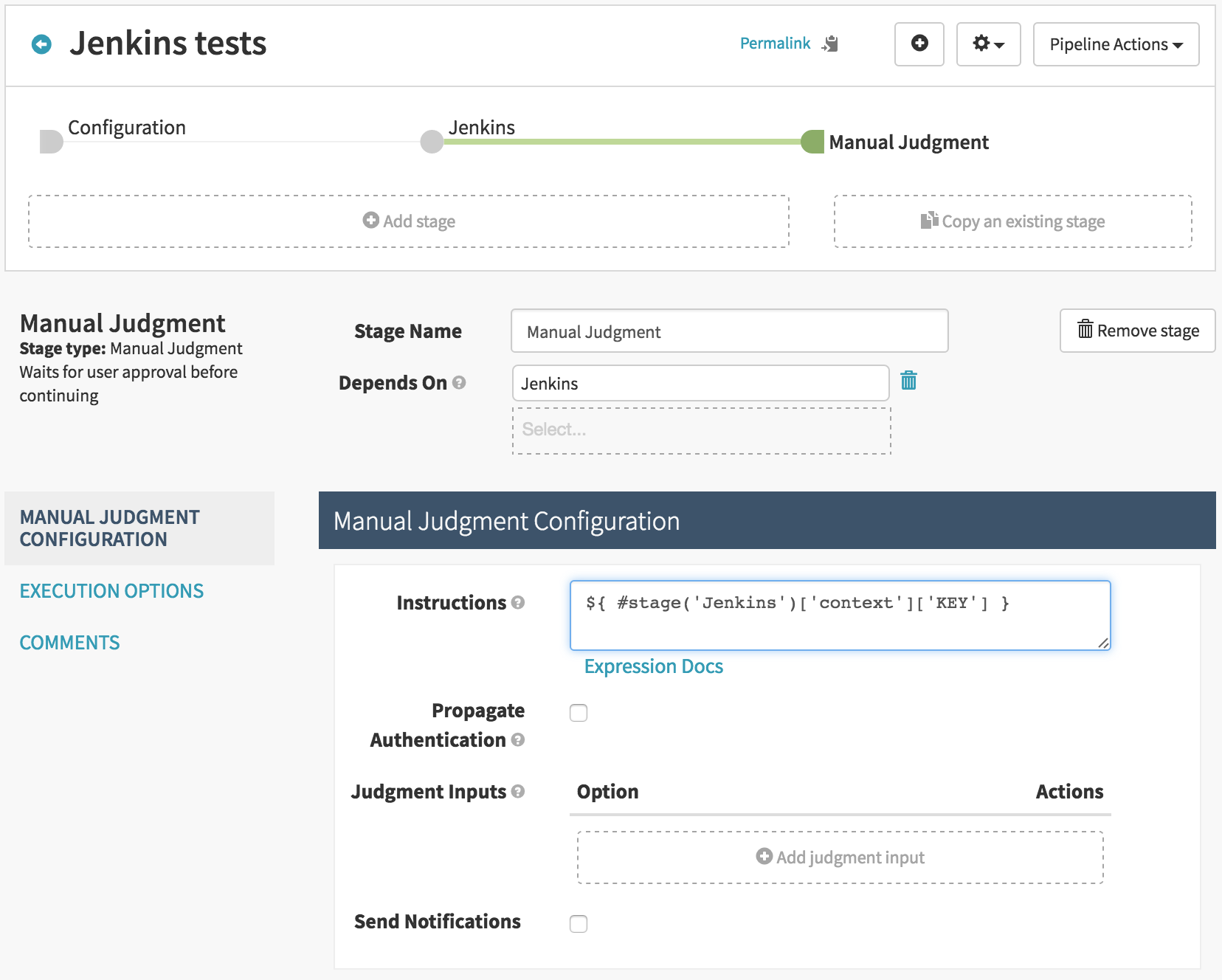 In this example, we will create a pipeline with a Jenkin’s job stage and a manual judgement that repeats back the value of a property in a properties file from the Jenkins’ job.