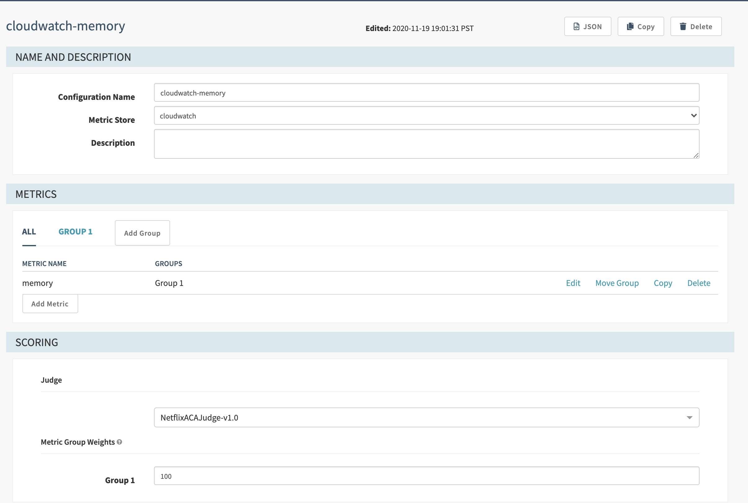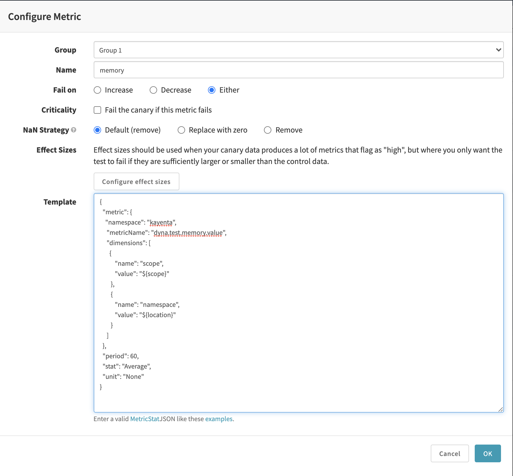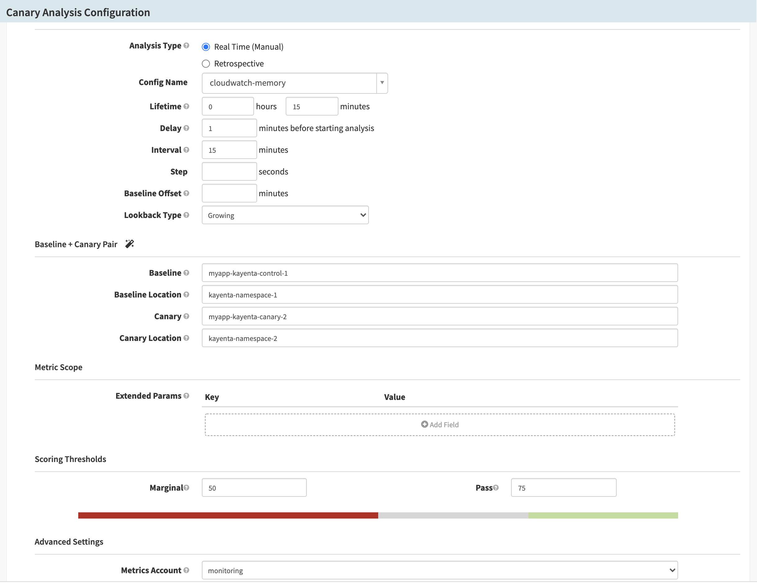 In your canary stage, set up the canary config you just created. Then use the app values from AWS CloudWatch to fill in the Baseline + Canary Pair and MetricScope fields.