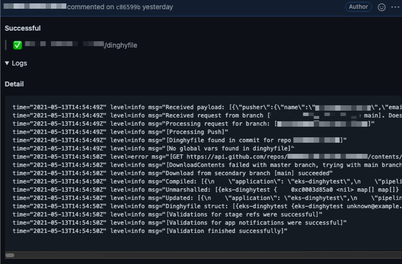 Dinghy can provide more robust information to GitHub about executed pipeline changes. This information appears as a comment in the PR.