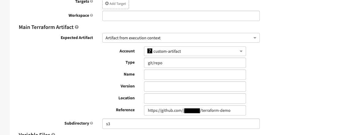 backendArtifactand other artifacts, you can replacegithub/filewith some other artifact type. For example, if you’re using the BitBucket artifact provider, specifybitbucket/fileand the corresponding artifact account.The Terraform Integration supports remote backends as a feature. Select a Terraform version that is 0.12.0 or higher when configuring the stage. Then, you can use Terraform code that references a remote backend.