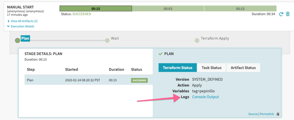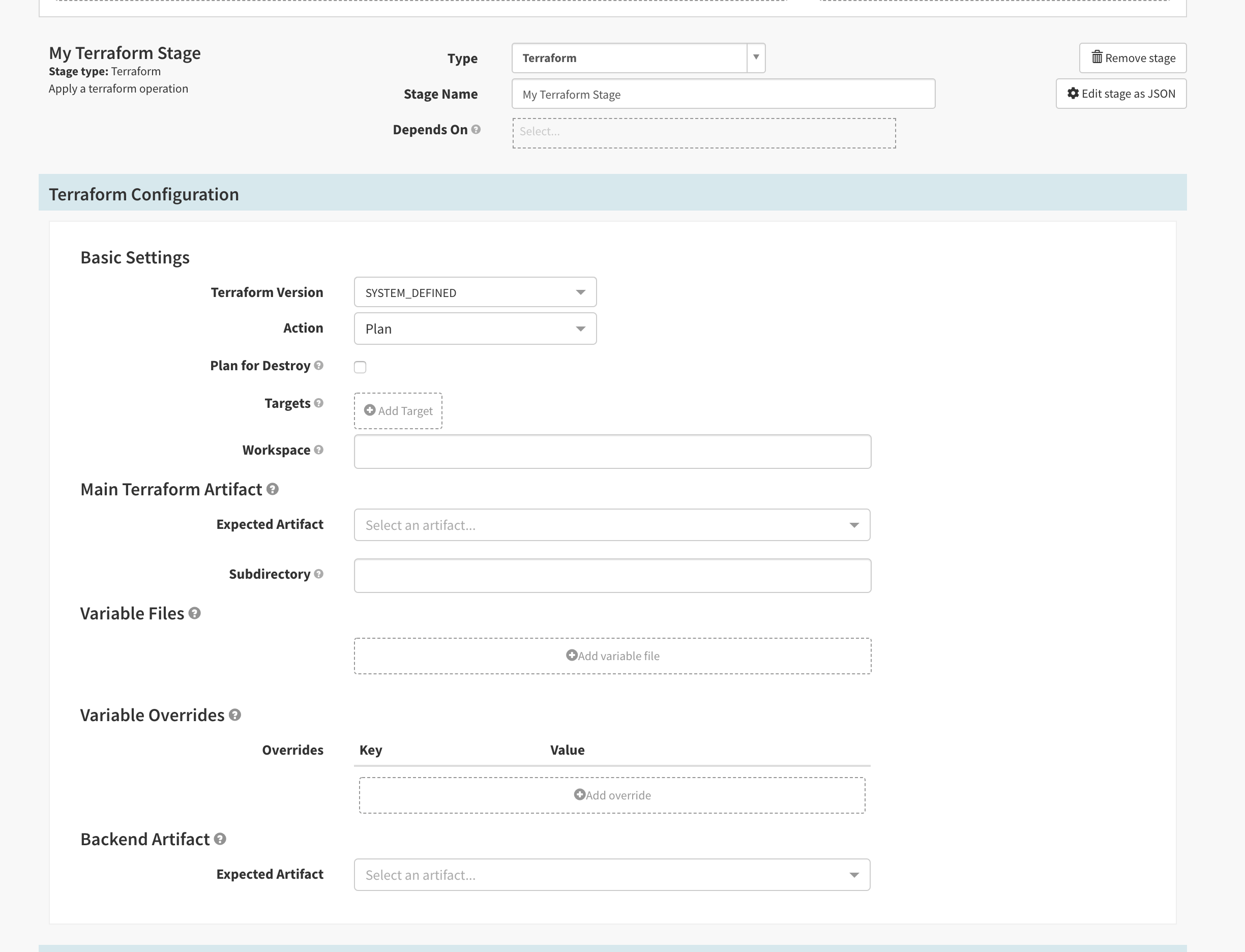 -var-fileoption.- If you want to use the output of a Plan stage for an Apply stage, select the Plan stage output as an Expected Artifact